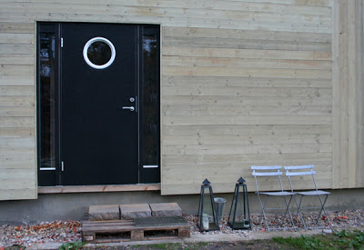 Huset är enkelt och inspirerat av en lada men med modernt snitt, självklart skall dörren vara enkel och modern!
