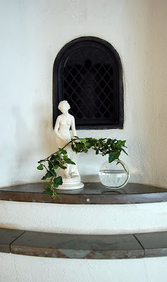I väntan på julpyntet på spiselkransen, får en liten statyett föreställande en grekisk gudinna, samsas med en murgrönakvist, i en ekollonvas från Svenskt tenn!