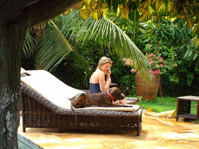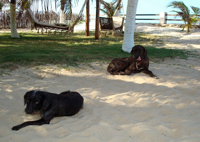 Det är ju inte helt ofarligt att vistas i Brasilien. Det finns inte bara farliga djur, brottsstatistiken ligger i topp på världsrankingen. Av den anledningen beboddes huset inte bara av oss, utan även av en superstor vakthund (den längst bak) och hennes pojkvänn, den lilla gatukorsningen längst fram i bild! På natten fick vovven förstärkning av en gubbe med käpp som troget patrullerade i trädgården!