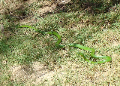I den prunkade trädgården var det inte bara fruktträden som trivdes, sådana här små gynnare dök upp emellanåt, helt ofarlig men My Goood så äckligt! Tyvärr hittade vi en inte lika ofarlig släkting till ”gröningen” men den fastnade inte på bild. Släktingen känner vi vid namnet Kobra…