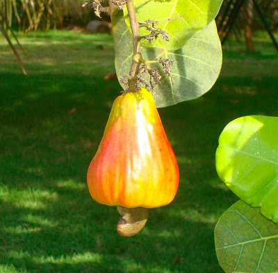 Varje dag serverades frukter från trädgården på stora fat! Det var bananer, vindruvor, mango, papaya och på bilden chashewnötter (nöten ligger i den lilla pluppen under)! På kvällen efter middagen fick vi alltid varsin iskall kokosnöt med sugrör i till efterrätt!