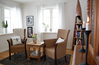 Igår var vi och kollade på skänken jag skrev om i förra inlägget. Den var jättefin och vi bestämde direkt att vi skulle köpa den. Nästan omedelbart när vi bestämt oss sa vi , nästan i mun på varandra, -Näää nu skall kanoten och rottingstolarna ut, det oanvända hörnet i vardagsrummet måste användas till något! I nästa sekund såg vi båda två den perfekta lösningen framför oss, en extremt skön soffa, nästan som en säng faktiskt! Den är svart, riktigt låg och tokdjuuup, perfekt TVsoffa! En vit rya, den svarta skänken, en stor TV, den nya ljudanläggningen och massor med vita gardiner/draperier längs fönsterväggen och som rumsavdelare så kommer vi att ha världens skönaste TV/musikrum på nedervåningen!