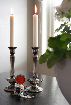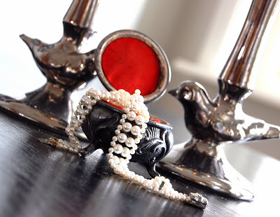 Nu till något helt annat! Jag har fotat så lite på sista tiden, gillar mest att fota i vackert väder utomhus! Men på förekommen annledning har det då inte blivit så mycket den här vintern! Hade sådan himla lust att fota något idag, Mateus ljusstakarna, min mormors ärvda pärlhalsband och en liten tennask med rött sidenfoder fick bilda ett litet stilleben! Fotokurs står absolut högst upp på min önskelista!
