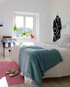 Den rosa mattan och den duvblå pläden harmonierar verkligen med varandra!