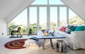 Åh, så fräscht med det vita och de fina färgerna på kuddarna och mattan! Rummet påminner förresten om vårt vardagsrum på övervåningen!