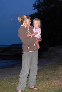 Hennes man har en dotter på 10 år som vår lilla ”Tildis” blivit mycket förtjust i. Efter middagen i kväll vaknade plötsligt vår lilla sessa och ville inte somna om. Istället blev det en tur till stranden och ett kvällsdopp för barnen och våra gäster.