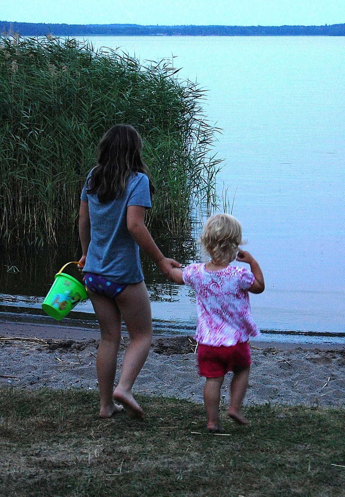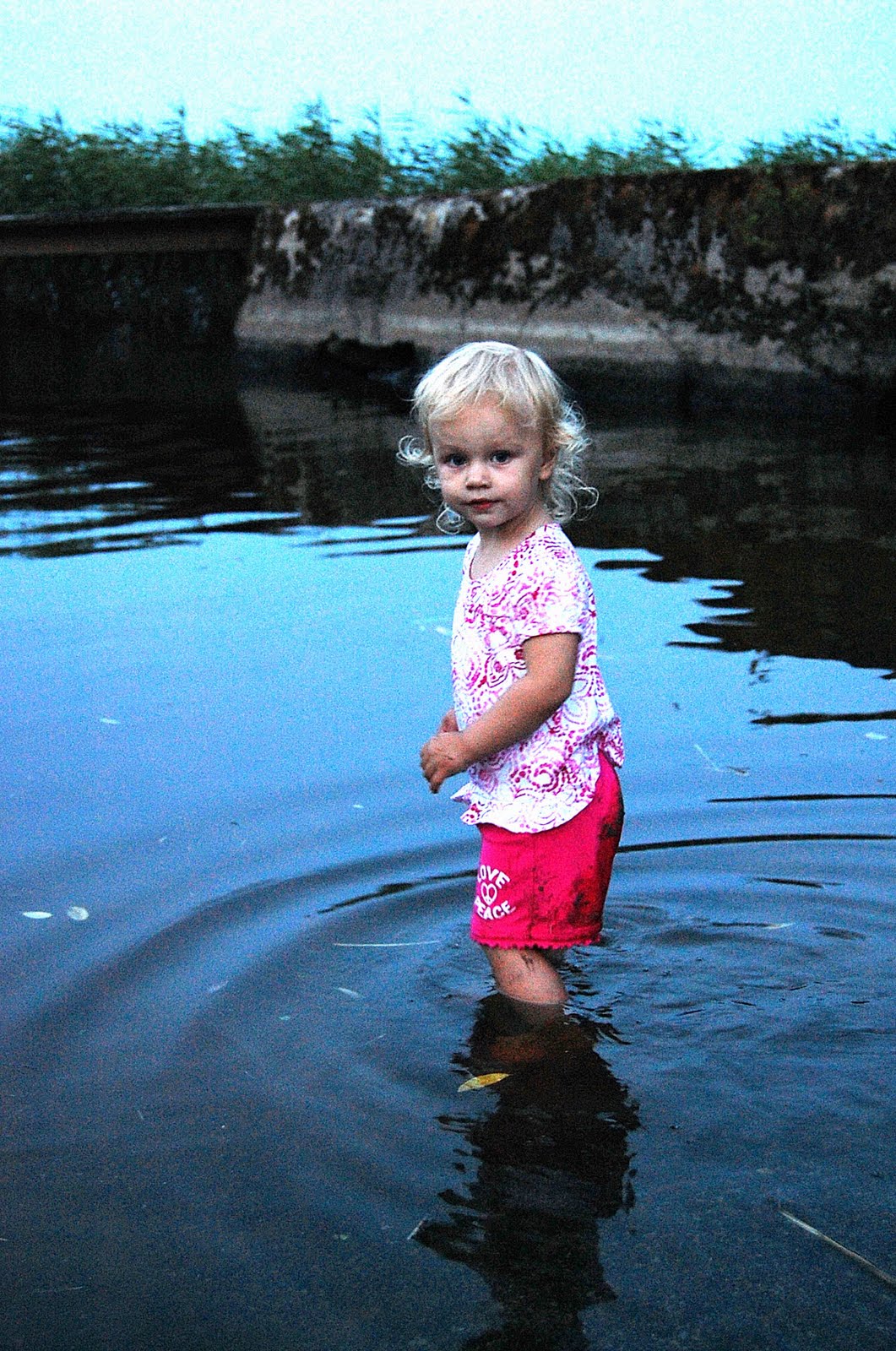 Så modig din lille prinsesse er. Bade alene er nok litt skummelt når man er så liten;) Utrolig fint det første bildet der hvor de to jentene leier hånd sammen:) Helt herlig stemningsbildet:))Kos deg masse i solen. Her har det vært regnvær, lyn og torden igår og idag..men nå begynner solen å komme igjen. Håper det blir deilig og varmt så vi kan bade, dra på sjøen med båten og grille til middag hver eneste dag…hele resten av sommeren !! :))God klem fra Line