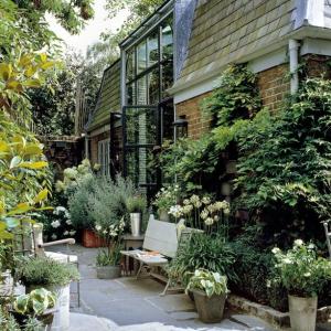 Vilken underbar lummig trädgård! Älskar den grå stenen och betongen tillsammans med de gröna växterna!