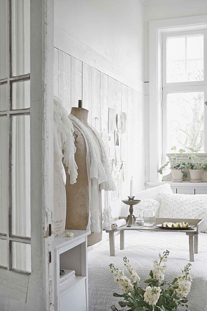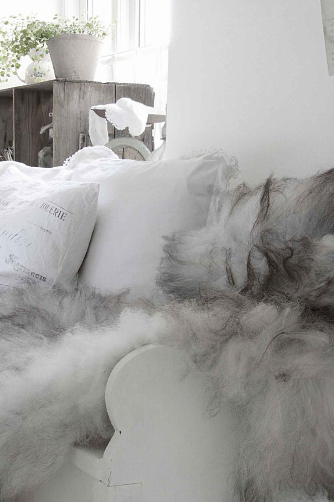 Vita kuddar, spets, och fluffiga fårskinn att värma sig med svala höstkvällar.