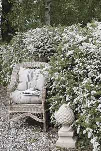 En lummig, lite hemlig trädgård med korgstolar, skall det förstås vara till ett gammalt kråkslott!