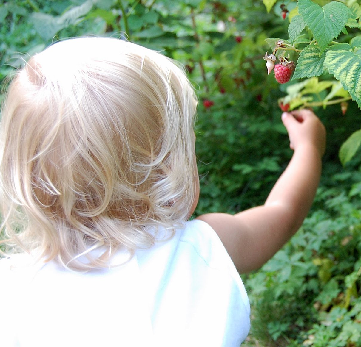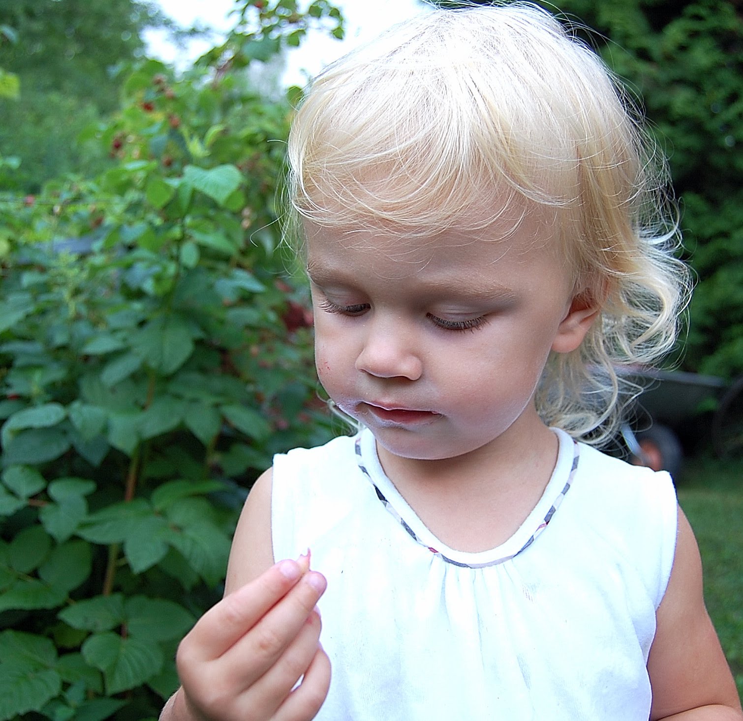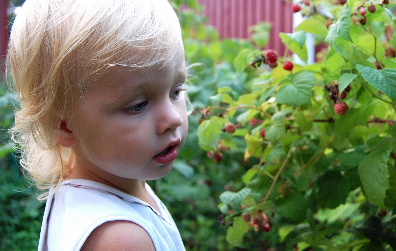 Här är det hallonhäcken som uforskas! Jag lovar att det är fler än en gång den här sommaren som jag har gnuggat bärflckar på små flick-kläder!
