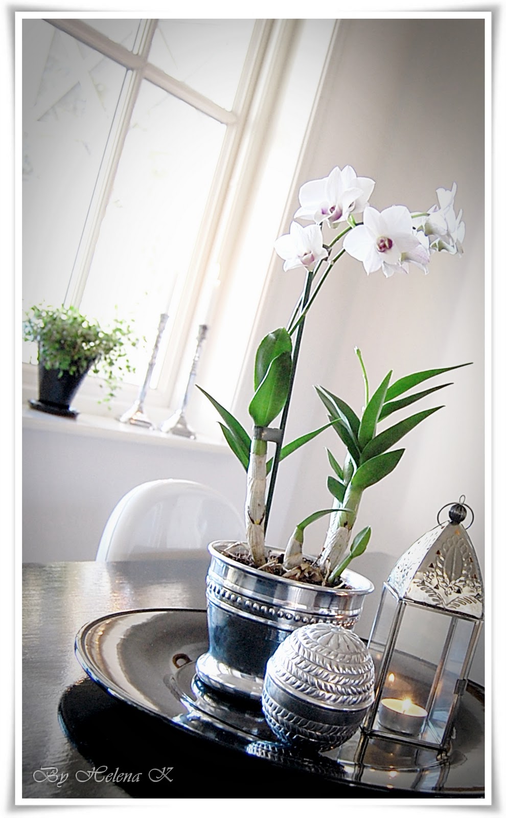 Greta: Tack för din kommentar, kul att även jag kan inspirera! Brickan är ett stort porslinsfat från Blomsterlandet, därifrån kommer också orkidéen och krukan. "Ägget" har jag köpt i en butik som heter Country Living och ljuslyktan är från en vanlig "krimskramsbutik" som heter Nisses!Kram Helena