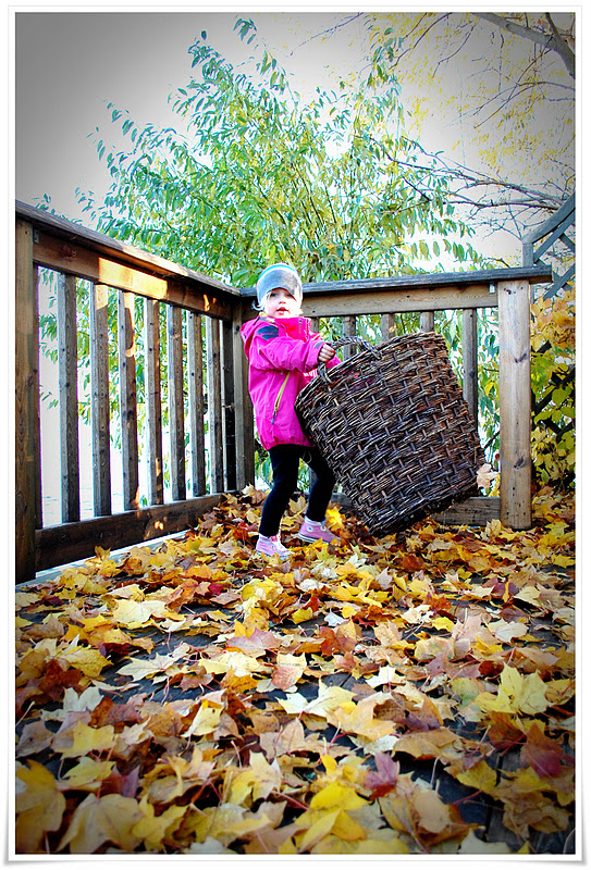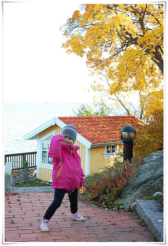 Lillan är så söt och hjälpsam, igår skurade hon fönsterbläcken rena från spindelbajs (oslagbar kombo för ett barn, regnkläder, diskmedel, diskborste och en vattenslang) och fick en slant till spargrisen när vi kom in. Idag skulle hon absolut hjälpa till med löven på bryggan.