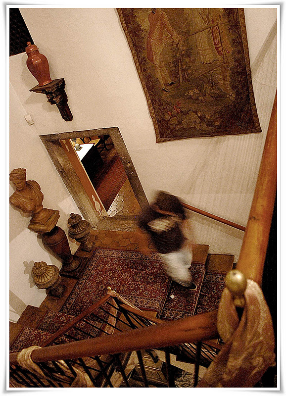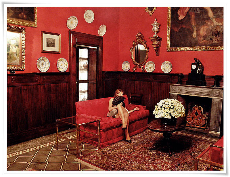 Det var strängeligen förbjudet att fotografera där inne (!), men det kunde jag ju bara inte låta bli, så det blev några pics i smyg. Inte heller kunde jag låta bli, att gömd bakom den solfjäder jag fick där (för det var varmt, riktigt varmt) bli fotograferad slängd i en röd plychsoffa i ett av förmaken!