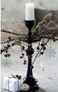 Grenar av lärk är också väldigt fint, det har jag redan tagit in. Tänk, för ett par år sedan hade jag aldrig ens reflekterat över att det över huvud taget fanns lärkträd i våra skogar. Sedan plötsligt exploderade det och så var det lärkgrenar på var enda pressbild som visades från de danska inredningsföretagen. Snyggt tyckte jag, och jagade iväg ut i skogen med barnvagnen för att hitta en gren. Träden var höga och grenarna gick inte att nå, och de grenar som låg på backen var muggiga, oh vad jag bökade med det där. Till slut fick jag väl tag på en som såg skaplig ut och gav mig glad i hågen av hemmåt. Väl hemma igen insåg jag att jag gått över ån efter vatten, ett par lärkträd bor i princip granne med oss här ute på Udden…