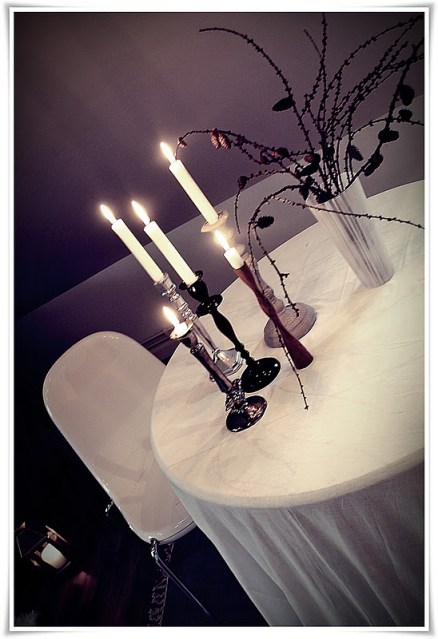 Jag orkar inte redigera bilderna nu, kommer att göra det i helgen, så ni får bara se en liten bild som jag tog precis innan jag började packa ihop. Inspirerad av den här superduktigatjejen gjorde jag en ”ripoff” (nästan) av hennes matbord på den här bilden. När mörkret började sänka sig över lägenheten, blev det så mysigt och stämningsfullt med alla ljusen så jag fortsatte att fota lite för skojs skull!