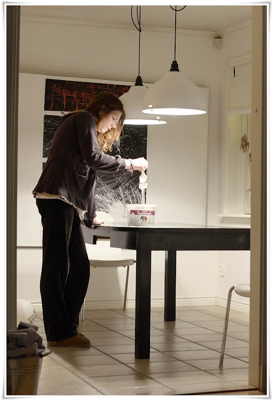 Det svarta köksbordet, som börjar bli slitet och som har lite för många hack i färgen