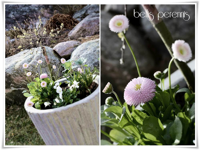 Slog till på någon form av videträd, som jag kan plantera ut sedan, vita violer och pärlhyacinter, en murgröna och superdupersöt bellis, som också är perenn och klarar sig i rabatten.