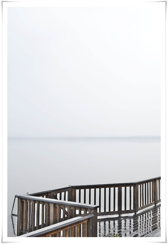 Sjön ligger precis spegelblank just nu, det är vackert trots att det mesta runt omkring är grått. Det är bara den smala mörkgrå remsan med skog på andra sidan sjön som markerar en gräns mellan himmel och vatten. Det känns som om det är långt kvar till badsäsongen…