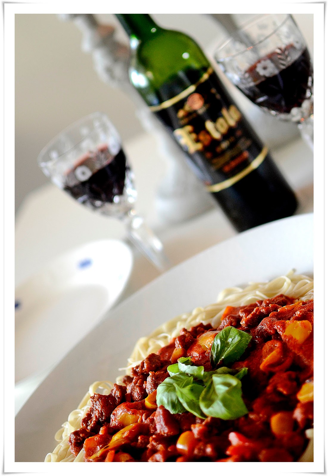 Korvarna sprättade jag upp och tömde innehållet i en stekpanna. Stekte korvmojset i olja från paprikorna samt en skvätt god olivolja. Fräste på det tillsammans med en klyfta tunt skivad vitlök, paprikorna och de passerade tomaterna. Kokade pastan med saltat vatten. Sedan lade jag pastan på mitt nya fina stooora fat från Mateus (som jag fick från snälla A i födelsedagspresent) och hällde såsen uppepå.