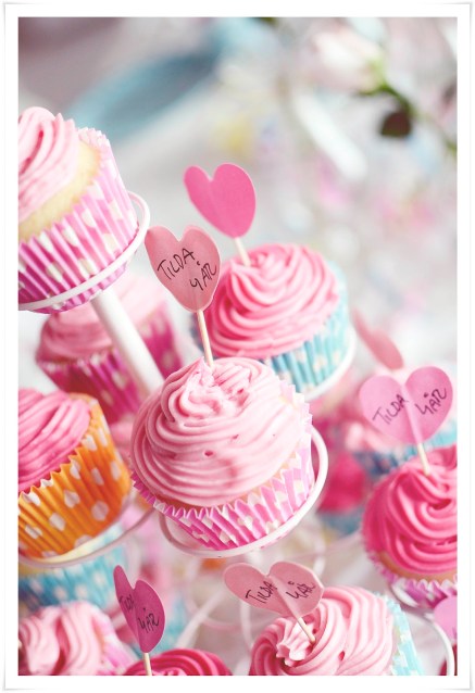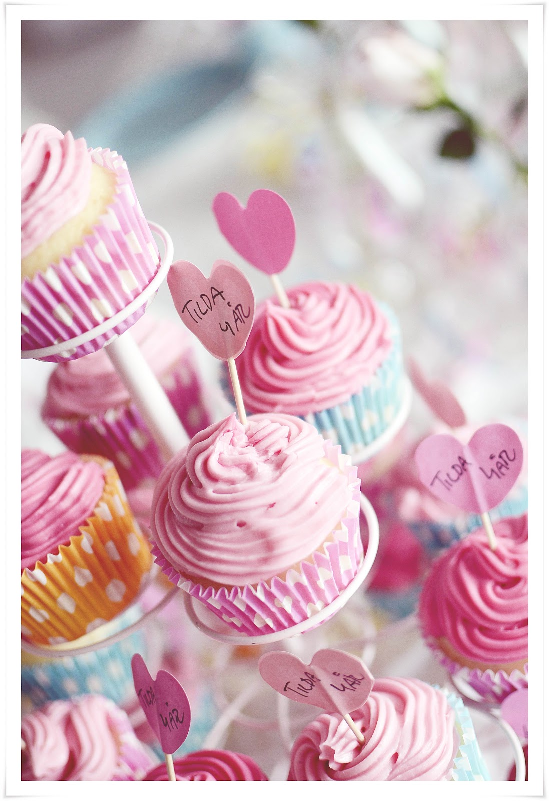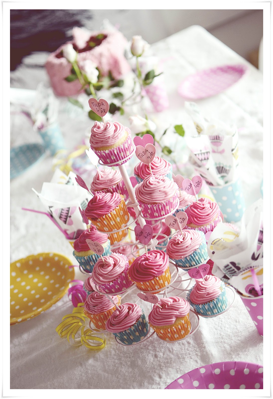 Vilka super fina cupcakes.Ovh dukningen är ju så söt.Har själv en liten tjej som fyller 3 år om några dagar.Undrar så vart du köpt tallrikar, muffinsformar och muggar??Kram