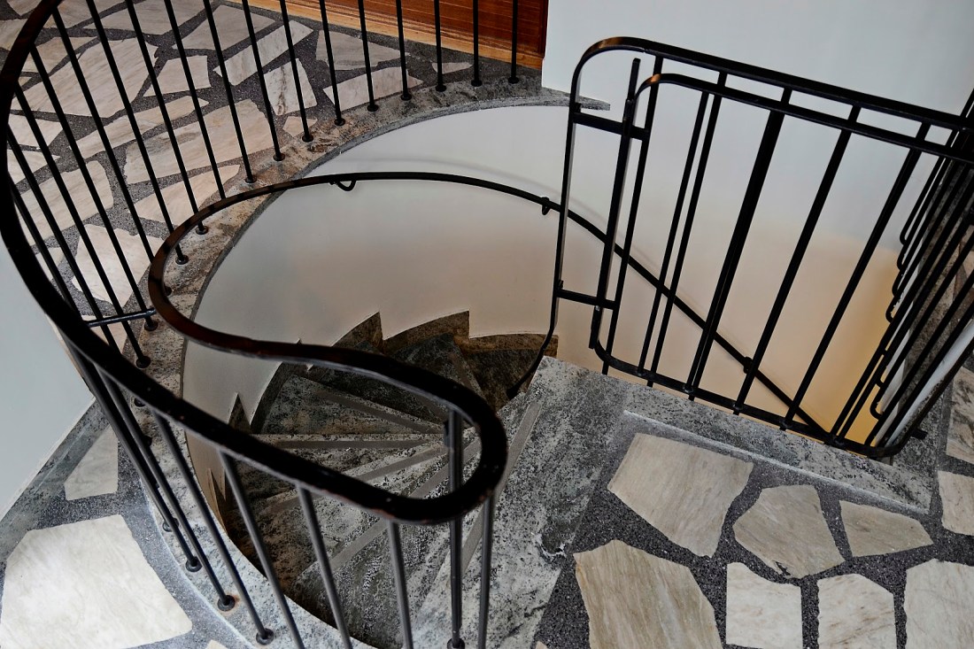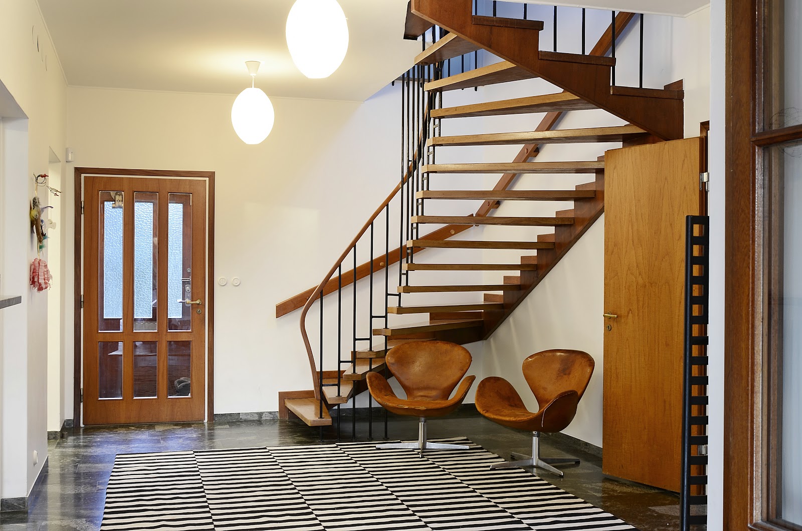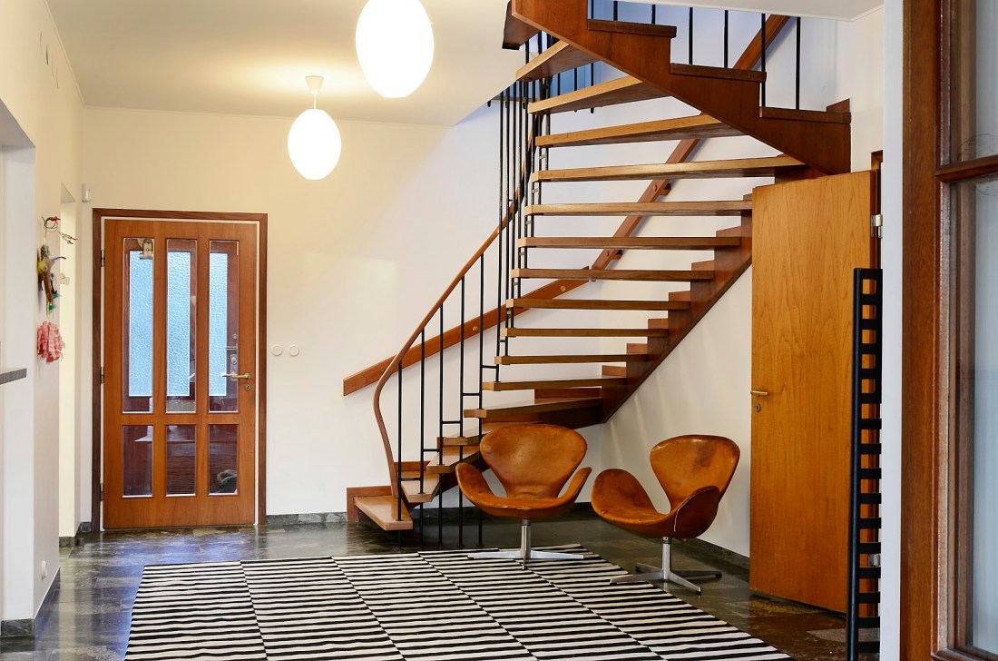 Huset fullkomligt svämmar över av fantastiska detaljer från 50-talet. Materialen, smide, teak, mosaik och Kolmårdsmarmor, bara en sådan sak. Observera det underbara trappräcket gjort i ett stycke.