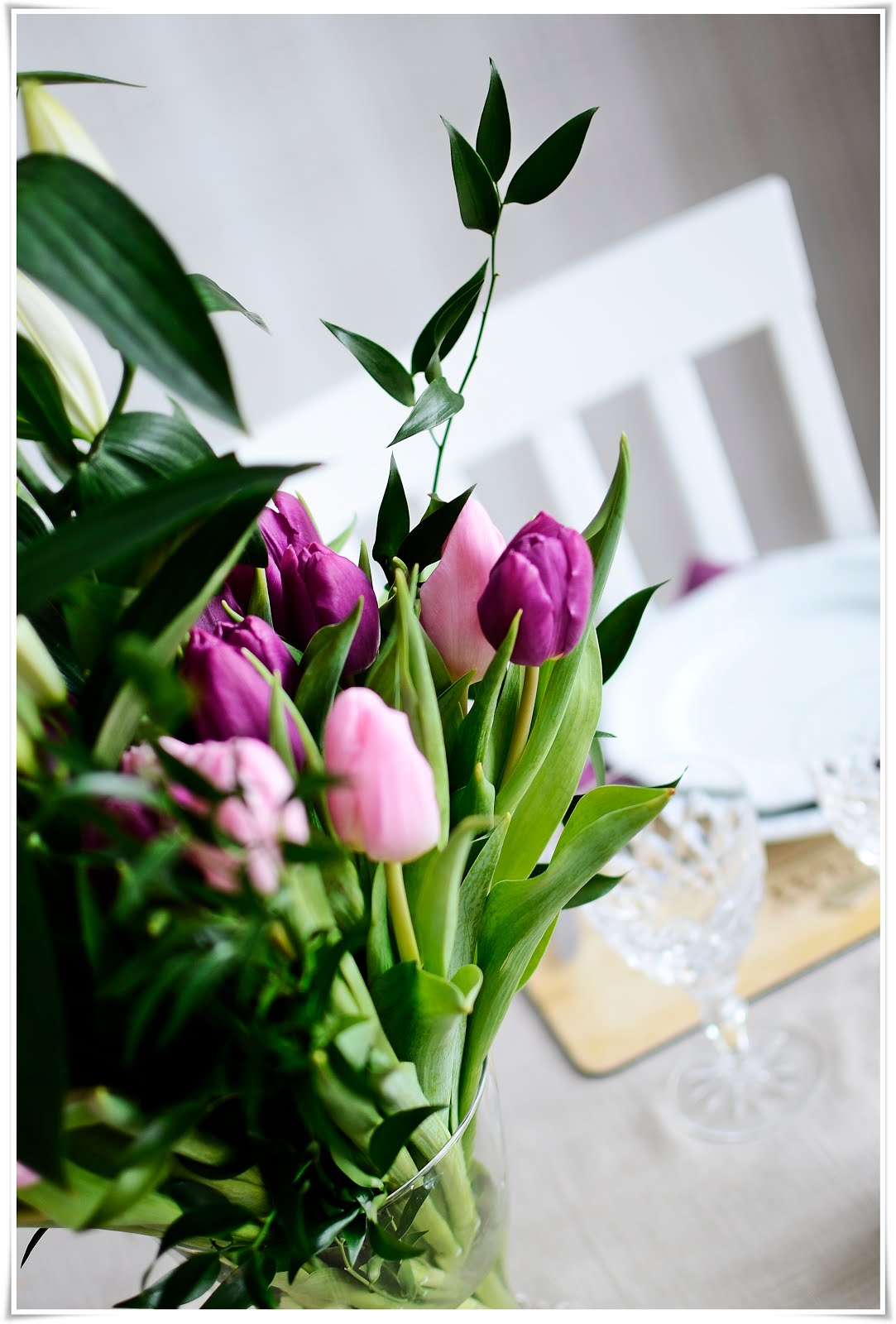 Härliga lila och rosa tulpaner på det dukade bordet. Det var kul, för den detaljen hade tjejen som äger lägenheten kommit på alldeles själv. Färdigdukat och fint var det när jag kom!
