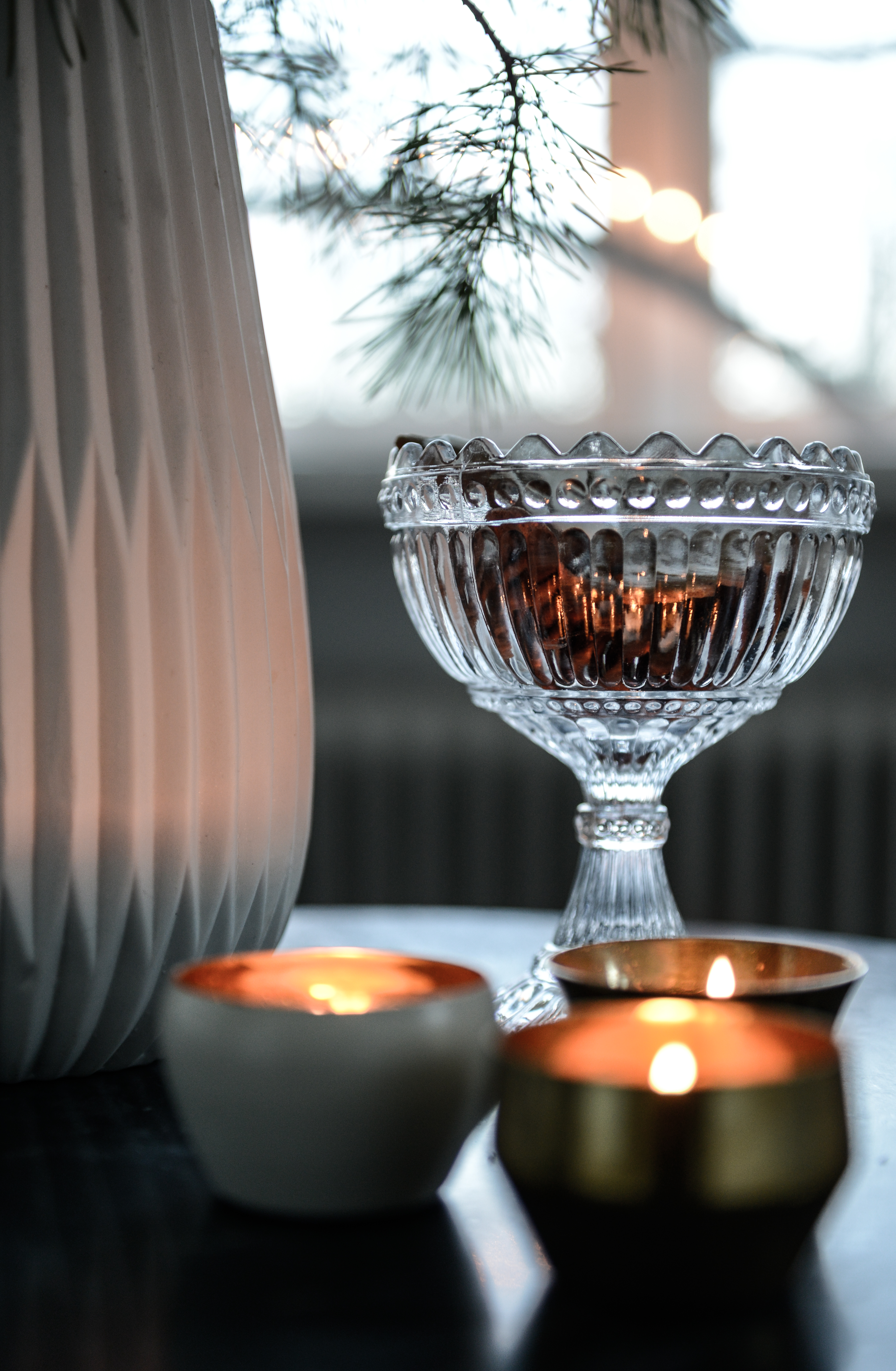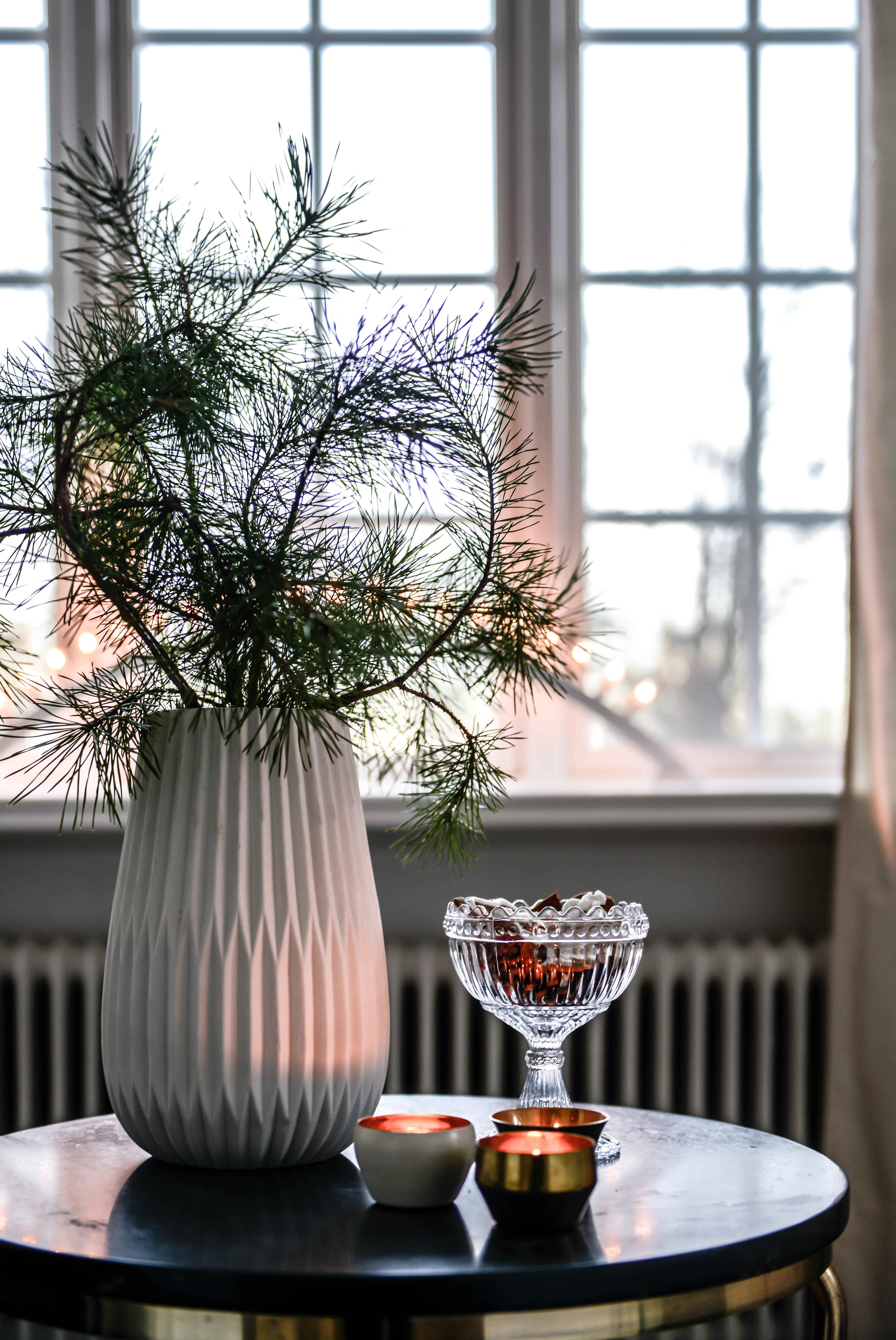 Sedan petade jag ned dem i en vas på hallbordet och så ställde jag dit några ljuslyktor och en skål med peppisar. Lillan och storasyster bakade härom kvällen så det är sådana där fina oregelbundna barnpeppisar som är de allra godaste 😉