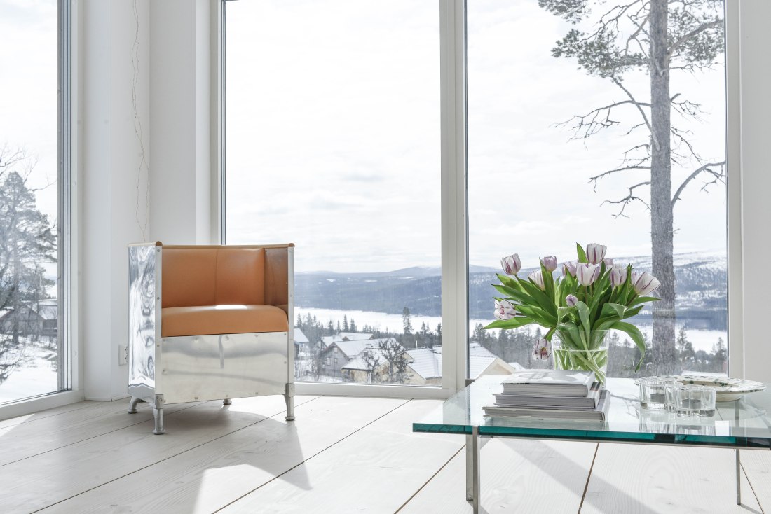 Hösten 2007 köpte vi tomten här i Lofsdalen och började planera för hur allt skulle se ut. Sedan tog det hela 5 år innan vi satte spaden i jorden och började bygga drömhuset. Två saker var klara redan från början. 1. Vi skulle ha Dinesengolv och 2. Vi skulle ha Mats Theselius Aluminium fåtölj i huset!