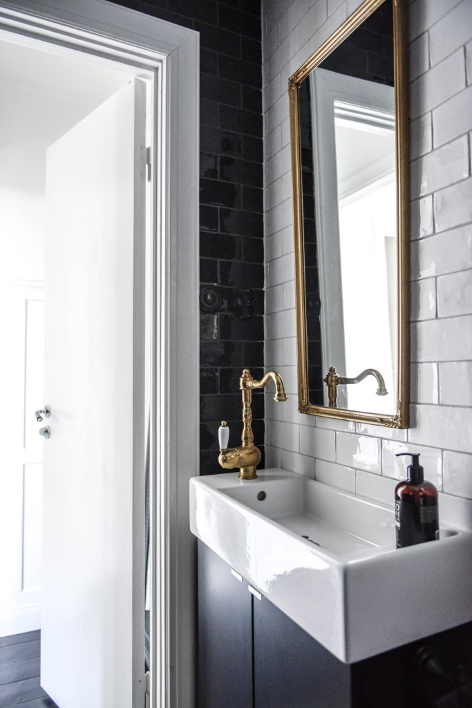 Kakel från Hedlunds golv, handfat och kommod (omlackerad, var vit från början) från Ikea och golv av betongplattor designade av Mats Tesselius från Marrakech design.