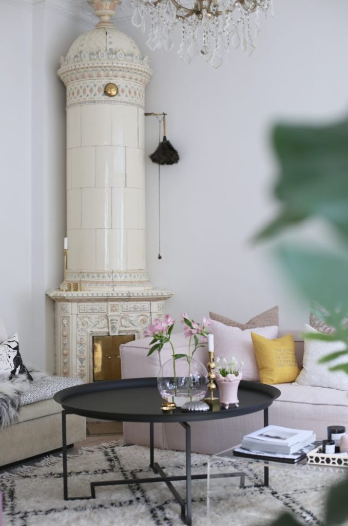 Vardagsrummet hos Inredningshjälpen, som roddas av stilsäkra Anette, är ljuvligt ljust och pastelligt. Den gula kudden bryter av fint och binder ihop det snyggt med kakelugnens mässingsluckor och ljusstaken på bordet.
