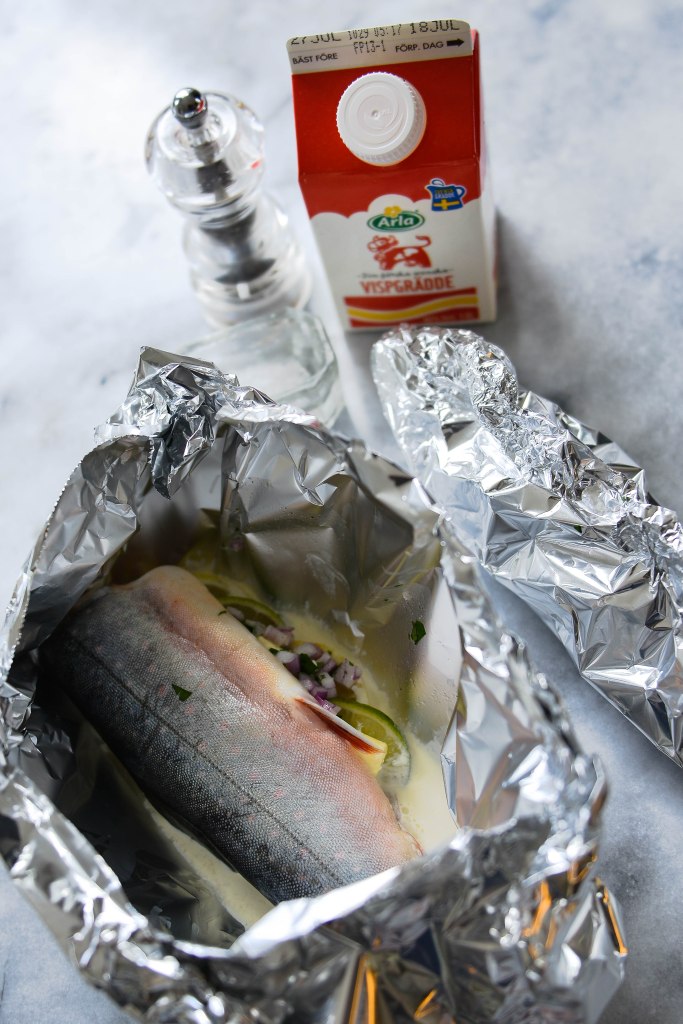 Lade fisken i formar skapade av aluminium (se till att de inte läcker) och hällde på en skvätt grädde. För säkerhetsskull saltade jag lite extra också. Fisk utan fjäll är ypperliga för denna rätt, annars måste man fjälla fisken först. Hatar fjäll och tycker att det är döäckligt om jag råkar få ett i maten eller ännu värre… munnen!