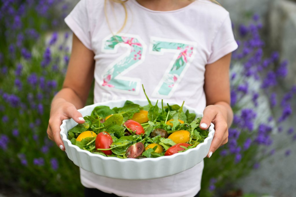 Serverade en grönsallad på ruccola, bladspenat och mixade tomater (olika färger) till. Dressing gjorde jag av olivolja, vitvinsvinäger, Dijonsenap, dill, salt och peppar. Riktigt gott!