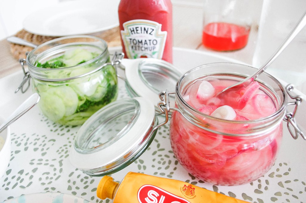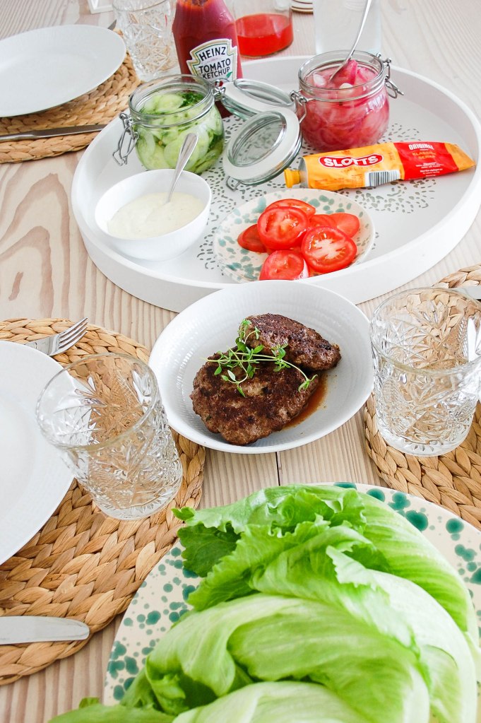 Till det hade jag gjort pressgurka, picklad lök och egen pestodressing. Vi gjorde en ”Max-hamburgervariant” och tog salladsblad istället för bröd.