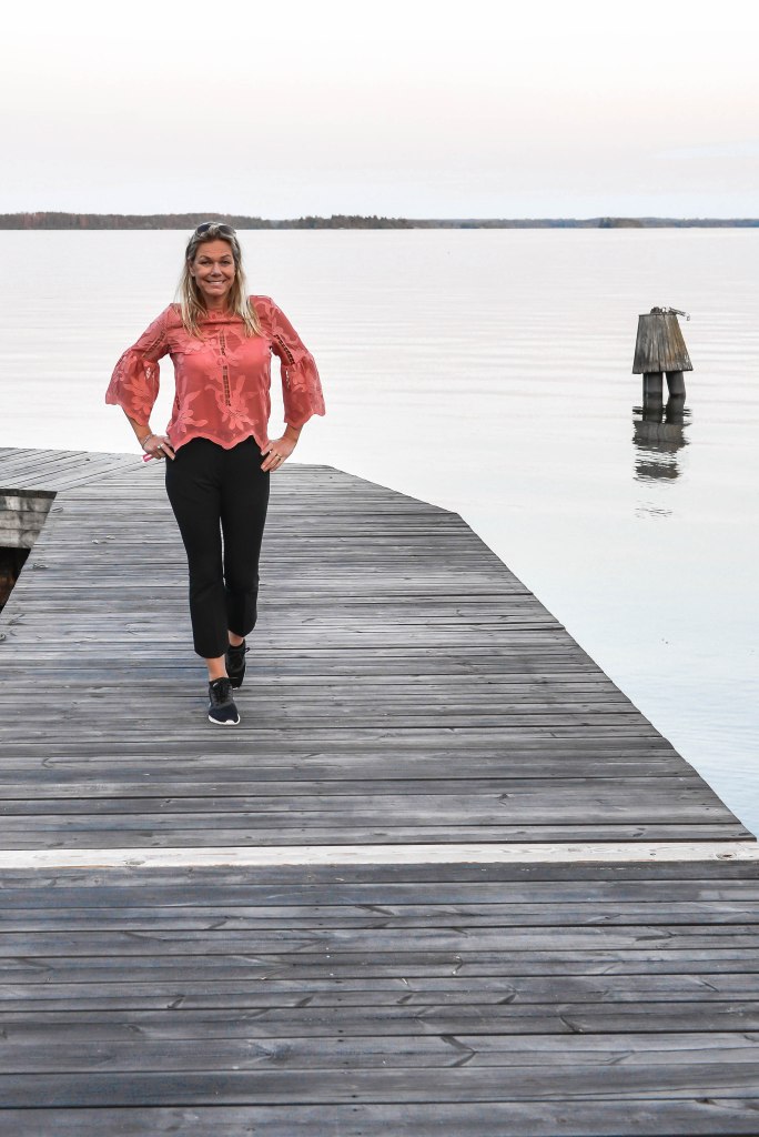 Vi tog en tur ned på bryggan, och trots att klockan var ganska mycket så var det varmt och skönt och helt ok med en tunn blus. Den söta blusen finns HÄR (adlink), och byxorna som är de nya supersköna favoriterna finns HÄR (adlink).