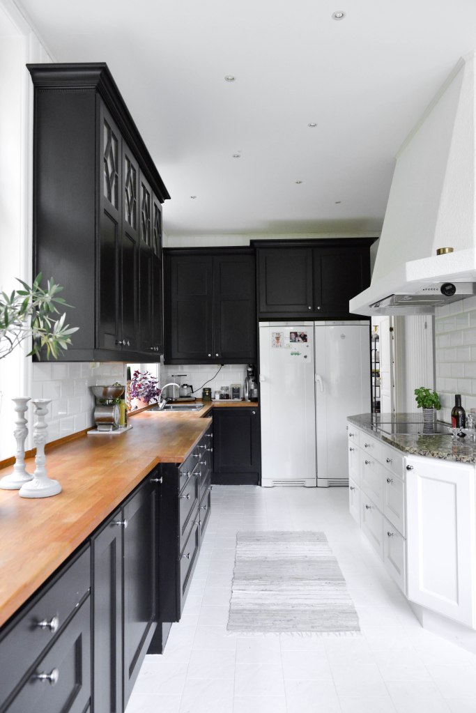 Men så igår kom jag på det! Nej, den ska inte alls vara ljus, den ska vara ”svartish”! Som i svartek! Nu har jag kollat på en massa bilder på det och det känns superrätt. Mindre bondkök och mer modernt, men ändå med bondkökets karaktär. Hänger ni med. Det kommer att bli mer modernt, cleant och mycket mycket roligare att fixa och styla på bänken. Hur jag än burit mig åt på den här orange bänken så har det aldrig känts bra.