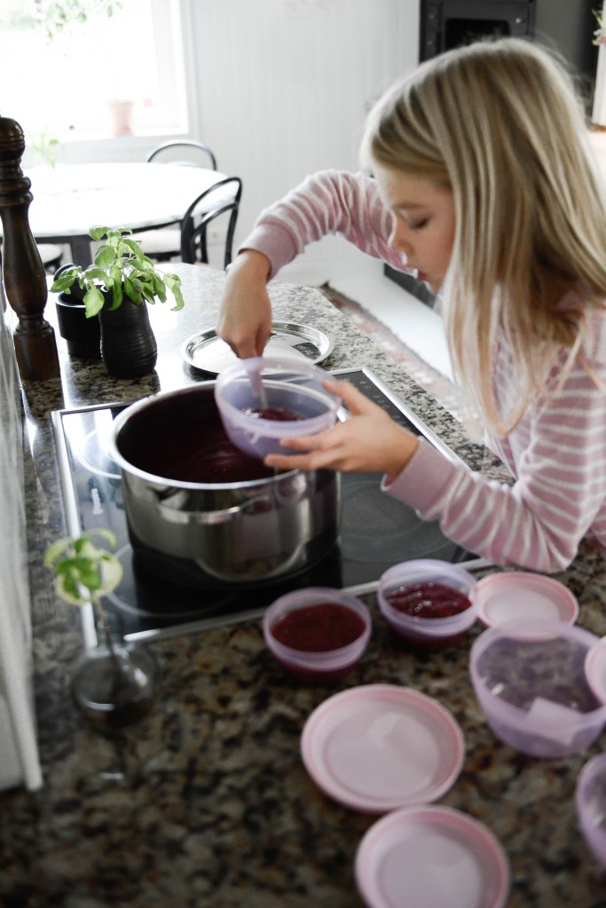 Sist jag storhandlade köpte jag en påse frysta hallon och en förpackning syltsocker, och i lördags gjorde Lillan sylt av det. Det är ju helt busenkelt och jag kommer aldrig mer köpa färdig sylt! Jag har nog alltid tänkt (mest omedvetet tror jag) på egen sylt som något man gör med färska eller i alla fall egenplockade bär. Men så behöver det ju inte vara. En påse frysta bär för en dryg tjuga i affären duger precis lika bra. Några deciliter socker, behöver inte ens vara syltsocker, och så kokar man upp det och vips så har man en sylt som innehåller bär på riktigt, och faktiskt bara bär och socker! Läs på en förpackning köpt sylt så kommer du se att den typ innehåller ”spår av bär” plus en massa annat jockel som man kan vara utan.