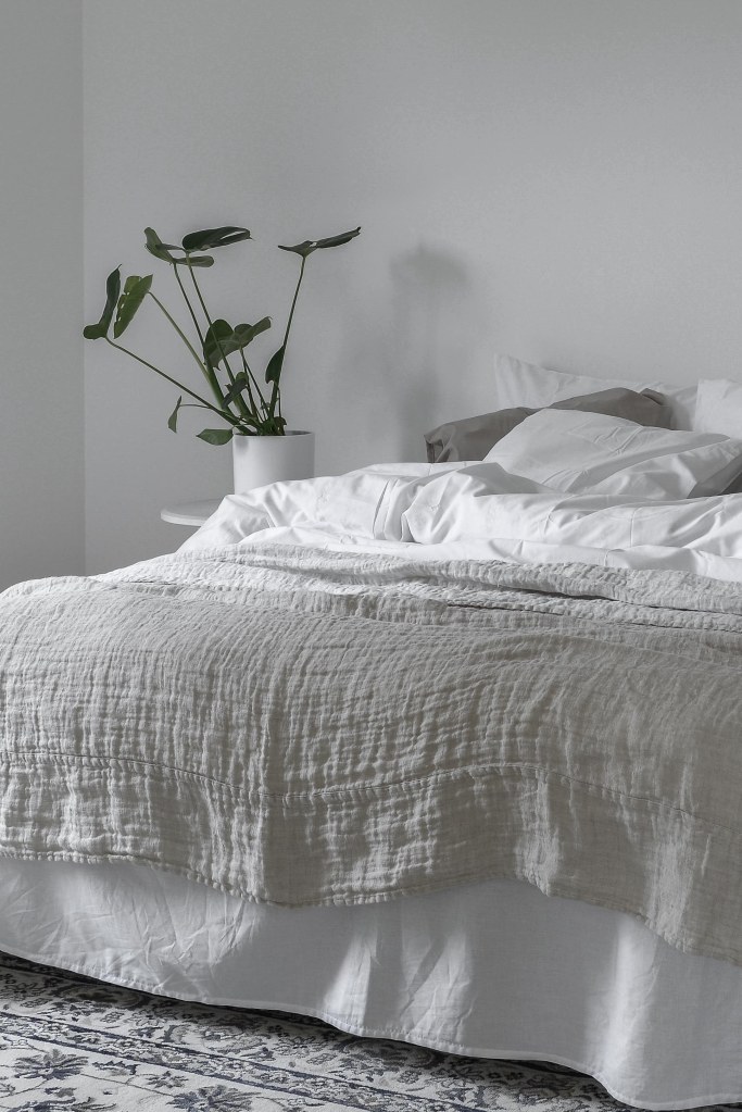 Jag kom på att ni var flera som undrade över överkastet som vi använde vid homestagingen för någon vecka sedan (där bilderna kommer ifrån), och även i youtube-klippet där jag fuskbäddar hemma i mitt eget sovrum. Det är ett riktigt härligt linneöverkast från Linum. Jag valde att köpa enkelsängvarianten, och lägger det sedan bara på nedre delen av sängen. Ni vet lite hotellbäddning sådär.