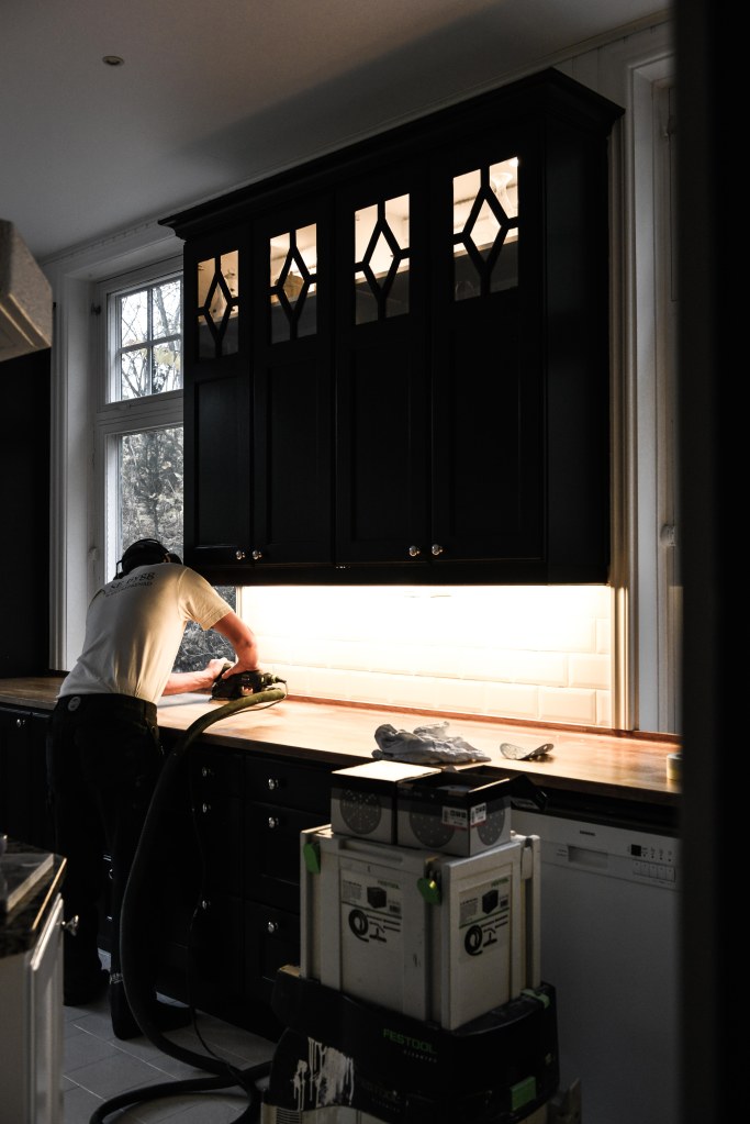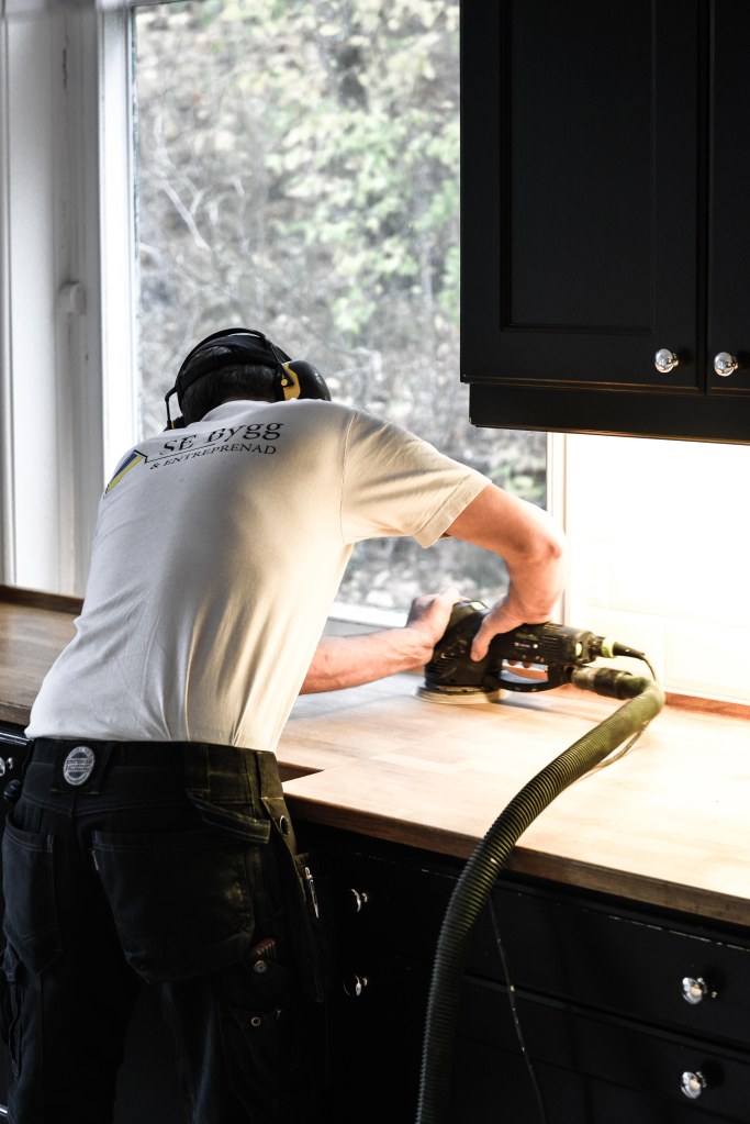 Jag måste erkänna, det sket sig lite, om ni ursäktar uttrycket. Tur att man har hantverkare som med blixtens hastighet kommer till undsättning när något går fel. Som tex när man försöker behandlar en redan oljebehandlad bänkskiva i ek och inser att allt ”klägg” man strukit på bara ligger uppe på ytan och aldrig kommer att tränga ned i träet som det ska göra…