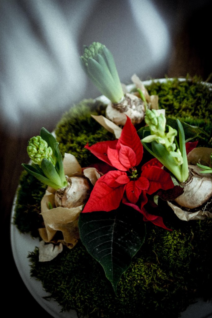 När jag städade undan bordsdekorationerna sparade jag förstås blommorna och en del mossa. Sedan gjorde jag ett arrangemang på ett stort keramikfat som jag har. La mossa i botten och så stack jag ned några hyacinter runtikring och en julstjärneblomma i mitten i en liten vas som doldes under mossan. Hyacintlökarna hade jag virat in i lite smörpapper. Världens enklaste jularrangemang, som inte behöver kosta mer än 3 hyacinter.