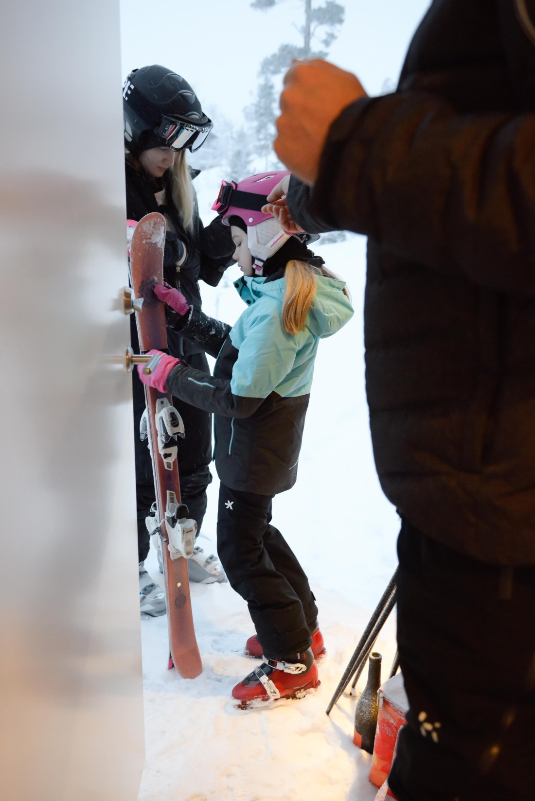 De var allesammans ivriga att komma iväg i morse, men speciellt ivrig var nog Lillan som fått både nytt skidställ och nya skidor i julklapp. Skidorna är så kallade ”twintip”, vilket innebär att de är böjda uppåt både fram och bak och gör det möjligt att åka både framlänges och baklänges, och snurra och trixa. Mest såg hon dock fram mot ”snösprutet” som blir bakom skidorna när man kör rakt framåt. Haha, söta de är de där små!