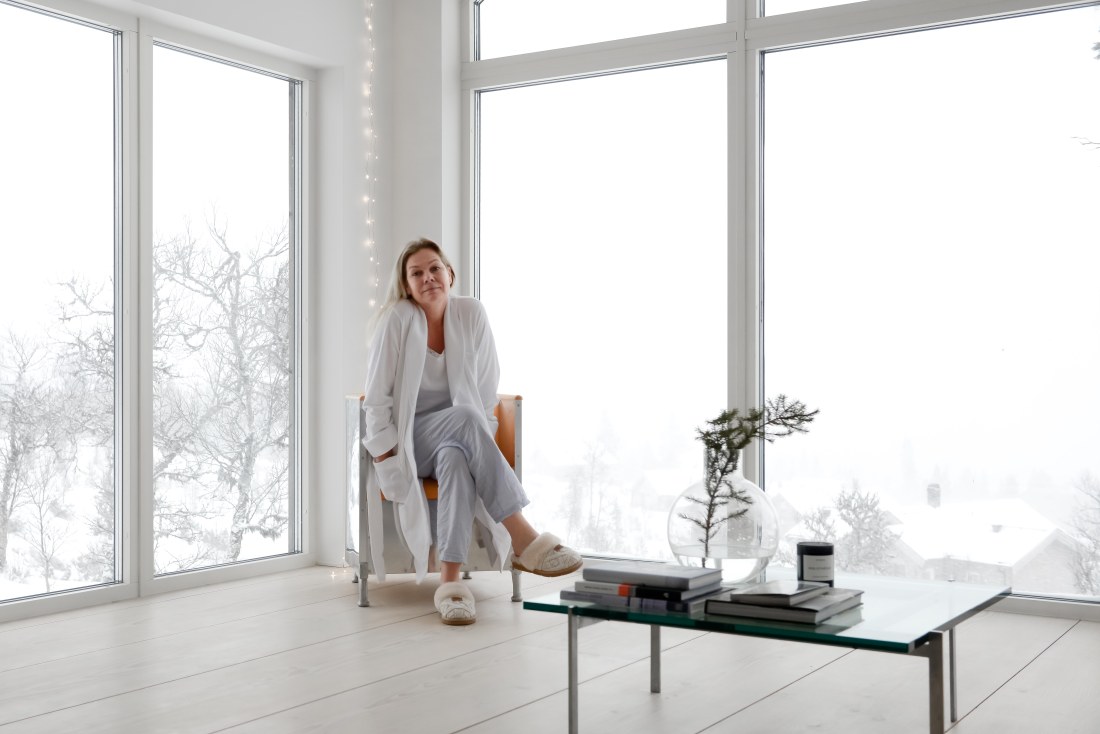 Ja, såhär myser jag runt här i stugan på förmiddagarna, och jag älskar det! Känns förstås extra mysigt med nya fina kläder. Ska ta och köpa mig ett par fina silkiga pyjamas också snarast 🙂