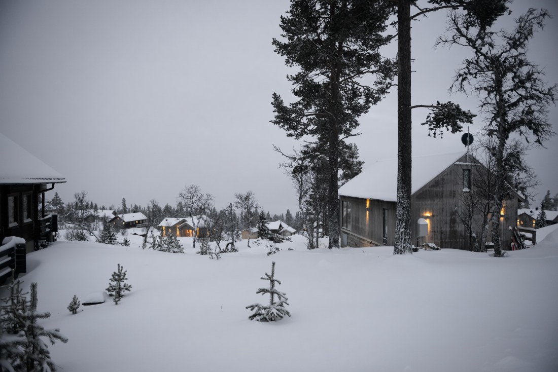 Jag kan nog säga att det snöat sedan vi hit kom. Inte en endaste minut har jag sett sjön nedanför träden, och inte har jag sett mycket av backen heller. Vi är liksom bara inlindade i vitt fluff här uppe!