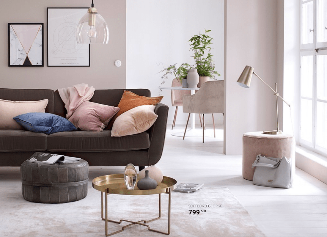 Dök på den här bilden från Ellos och jag gillar verkligen färgerna i den. Mjukt och gosigt och feminint tycker jag. Jag kanske inte går igång på den bruna soffan direkt, men de rosa/beige tonerna tilltalar mig. Tycker också att mattan är väldigt fin. Ska ta en titt på den om vi inte beslutar oss för att lägga in heltäckningsmatta. Lite sugen på det nämligen 🙂