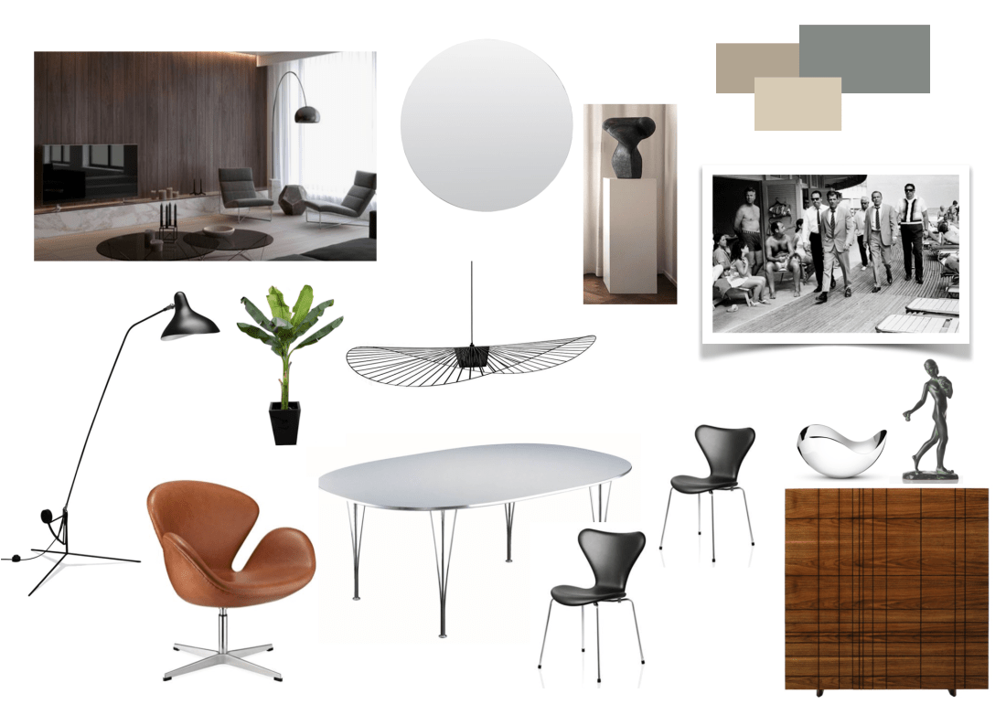 Golvlampa Mantis Rum 21 här, Takpendel Petit Friture, samma, här, Fåtölj Svanen Nordiska Galleriet här , Skåp Asplund – Rum 21 har flera här, Rund Spegel 110 cm Housedoctor, Rum 21, här, Skål Georg Jensen, samma, här