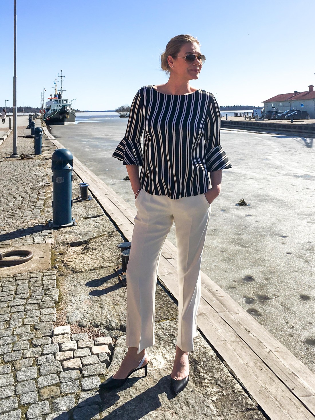 Rara butiksinnehavaren Anna visade mig ett par så galet fina och sköna gräddvita byxor. Jag har vanligtvis lite svårt för de där korta byxorna, men dessa var mjuka och ”fladdriga” med ett himla fint fall så det blev favvisar direkt! Kände mig så elegant i dem. Till det plockade hon fram de här fina skorna som var spetsiga med liten klack. Mjuka som tofflor säger jag bara och det kändes som att jag lätt hade kunnat gå en mil i dem. En silkig blus med lite kortare volangärm till gjorde outfiten så perfekt, och som sagt, jag kände mig så elegant 🙂