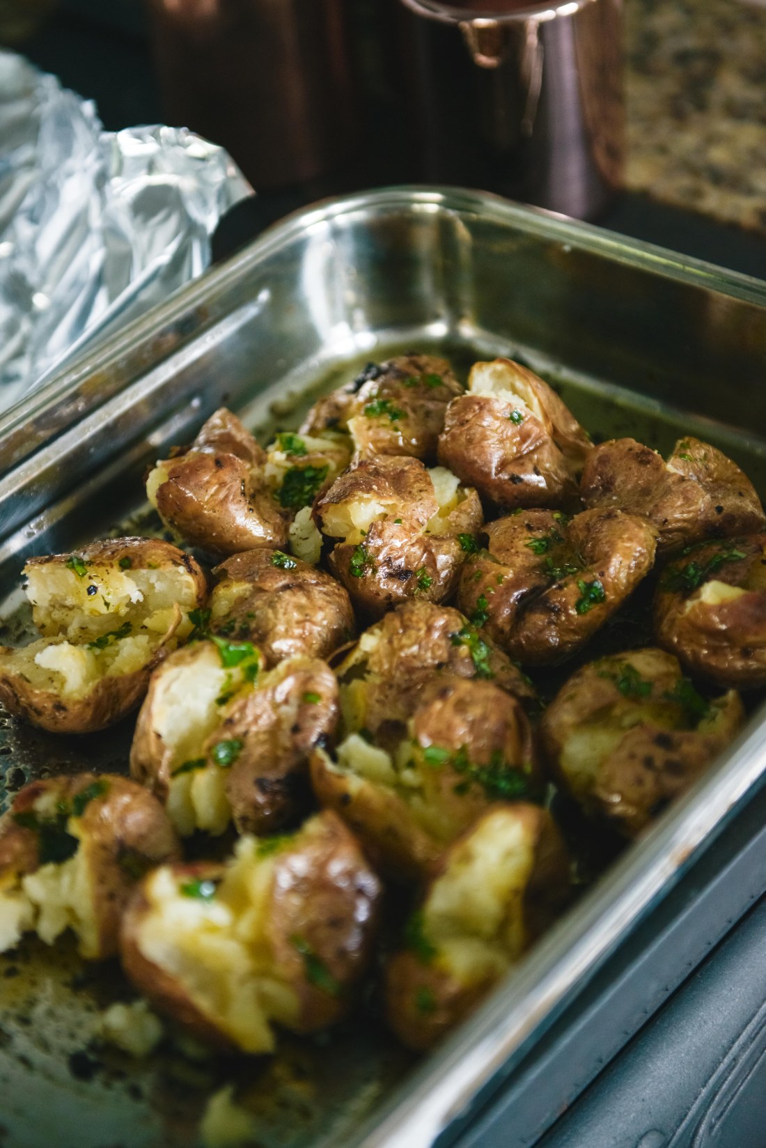 Inspirerad av min svägerskas (och svågers förstås) galet goda grillmiddag förra helgen, gjorde jag en variant på hennes örtpotatis. Hon hade kokat potatisen först, innan hon mycket lätt mosade till dem i en form, och hällde en örtblandning över för att sedan ställa in den i ugnen en stund. Själv skippade jag kokningen och bakade de hela små potatisarna i ugnen (i en mindre del av örtblandningen) för att efter det mosa dem lätt och hälla över örtblandningen.