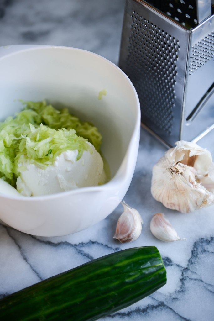 2 Blanda i yogurten och pressa i 1 eller 2 vitlöksklyftor