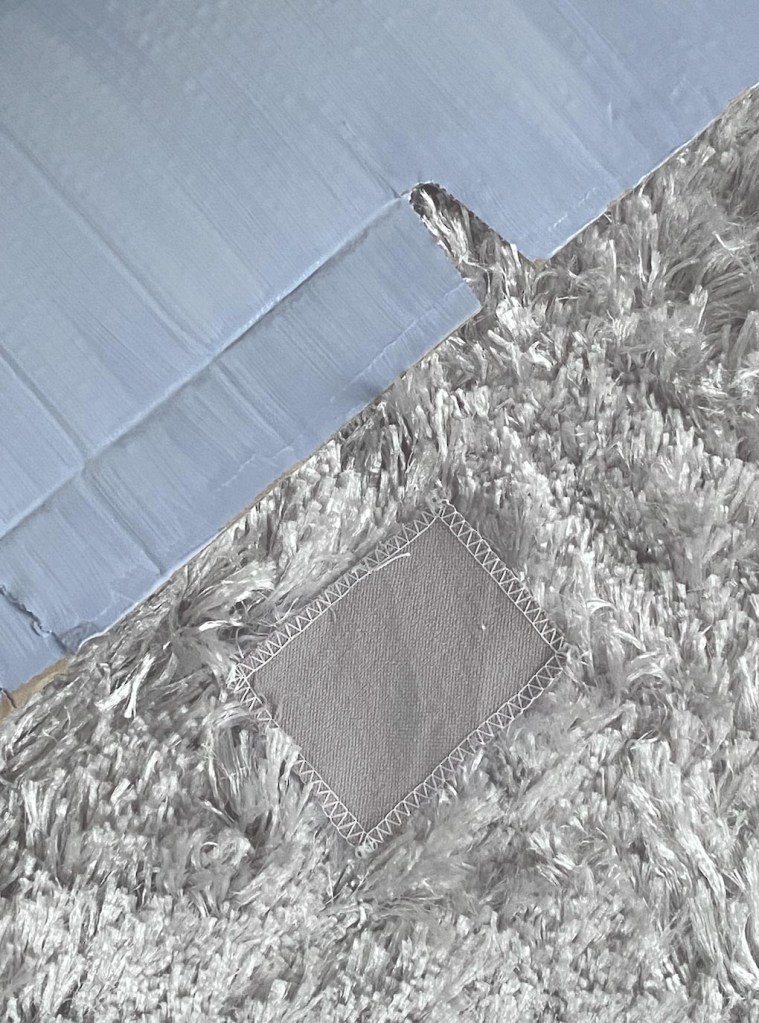 Eftersom jag inte kunnat besöka min kund som vanligt har jag provmålat på en bit kartong (färgen hade inte torkat riktigt, därav randig), och testat tillsammans med mattan och tygprovet på soffan, fotat det och sedan skickat bilderna till kunden. Smidigt, coronasäkert och inget nytt för mig. Har ju jobbat så i många år med mina utländska kunder.