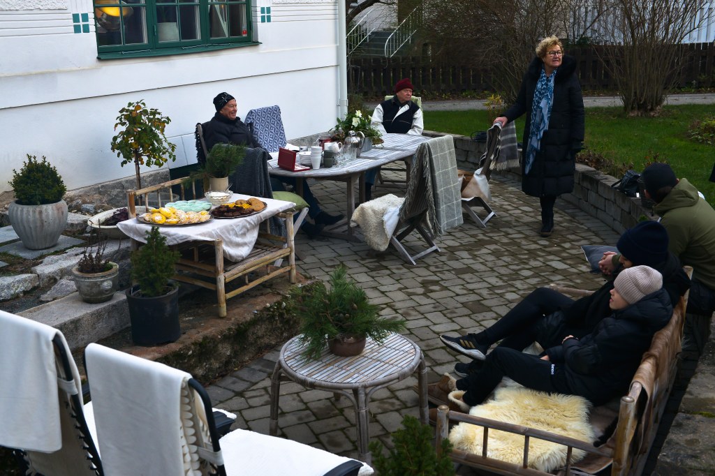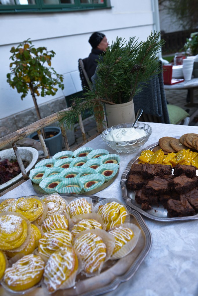 Vi plockade fram massor av kuddar och filtar, för det var kallt, och så placerade vi ut oss så som vi bor, och med avstånd till andra. Jag serverade allt kaffe och saft så ingen behövde ta i kannor etc. En och en fick sedan gå fram och ta för sig av godsakerna som Jonna och jag bakat. Jodå minsann hade jag bakat både bullar och kakor, kors i taket. Ganska kul var det också. Att baka alltså.